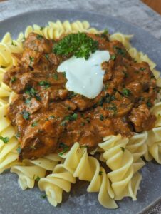 There’s rarely leftovers when I make stroganoff in my house, but on the odd chance there is, it’s delicious as a pie filling!