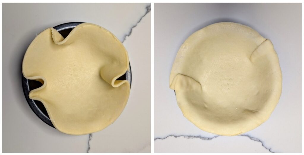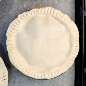 Tip: Use another pie tin as a guide to cut the tops the exact right size. Alternatively, a little bigger is better than a little smaller, since pastry shrinks in the oven.