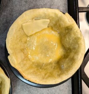 Tip: This helps to create a liquid-proof base for the pie filling, so the pies hold their shape and don’t break apart while you’re eating them. Depending on the filling, you can also add a thin layer of breadcrumbs over the bottom or a thin layer of cheese to create an additional barrier (both optional).