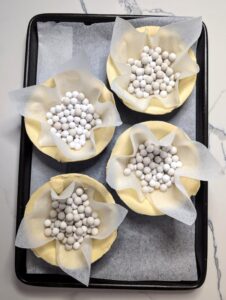 6. Place a small sheet of baking paper or foil in the centre of each pie dish, and fill each at least halfway with pie weights, or rice.