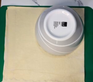 3. Cut the pie bases from the pastry: place something about 1 inch larger than than the pie dishes on top of the pastry (for example, I use a cereal bowl). Run a knife around the bowl to cut your bases.