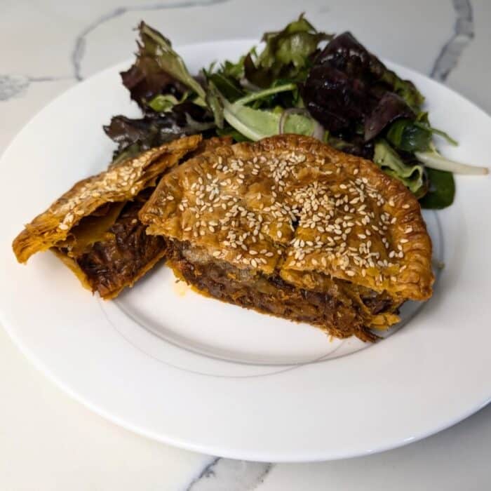 This recipe cooks the pies in the oven, therefore you’ll need pie dishes or tins. You might be able to use a deep muffin tray… I haven’t tried that, but I think it would work! If you have a pie maker, I’ve found that the pies cook much faster but they tend to explode and fall apart (so I don’t recommend it).